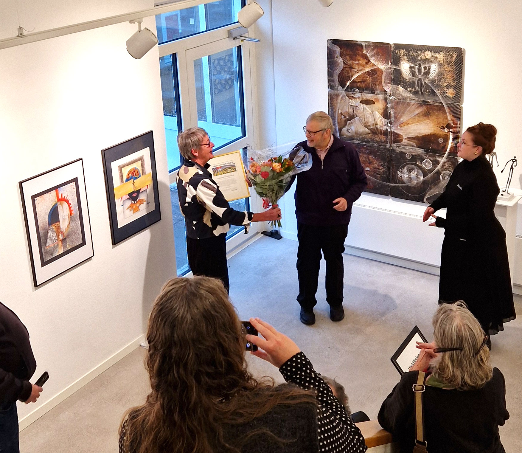 Så var det vernissage på galleriet. Blommor från kommunen och från vänner. Det var ju 15-års jubileum. Ca 35 peroner besökte utställningen under kvällen. 14 bilder såldes. Allt var väldigt lyckat. Lite trångt blir det ju ibland när man vistas så många på en så pass liten yta. Vi, Inga-Britt och jag bjöd på Cider och/eller sherry med tilltugg i form av olika små ostsnittar som Inga-Britt bakat samt vanligt tilltugg: Godis, chips, nötter m.m.