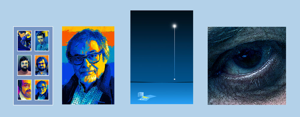 Själv hade jag med nedanstående 4 bilder. Vänstra bilden är en sammanställning av 6 porträtt. Överst till vänster som 17-åring - tillhöger om den som rekryt 19-åring - rad två till vänster är som 40-åring - och till höger om den som 50-åring. Nedersta raden till vänster som 65-åring och den nedersta högra och det större självporträttet är som 89-åring. Det stora högra ögat, Mitt vänsteröga" är också som 89-åring. Den stora blå målningen "Min identitet" MIN IDENTITET är ett slags självporträtt. BALANS, RYTM, RENHET, ABSOLUT KLARHET, MEN ÄNDÅ MÅNGTYDIGHET. INSLAG AV GEOMETRISKA FORMER. Här finns nästan allt av ovanstående. Den andra delen i bilden, himlaljuset och den belysta sfären, har också något med Pythagoras idéer att göra men även med mycket senare forskning om parapsykologiska fenomen, allt som inte kan mätas och vägas och inte riktigt vetenskapligt utforskas. Det som några kallar "flum" eller "New age". Man har ganska nyligen inrättat en professur i ämnet här i Sverige !
